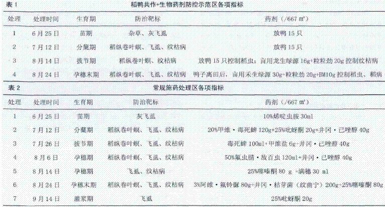 试验处理:稻鸭共作+生物药剂防控区;常规施药处理;不用药空白对照。不同处理用药各项指标如表1、表2。